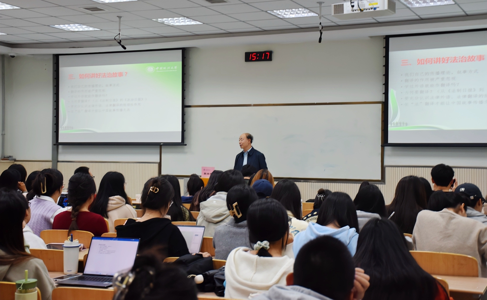 张法连教授从时代背景出发,强调了翻译在讲好中国故事、传播好中国声音中的重要性,分析了当前的国际传播工作存在的问题。他表示,要注重传播规律,讲好中国法治故事,树立好中国在国际上的法治形象,从而取信于国际社会。他指出,讲好中国法治故事离不开法律翻译,要有自己的传播理论和叙述方式,要重视培养涉外法治人才,充分认识法律外语、法律翻译的统领性作用,依“法”翻译才能让中国故事传播久远。
