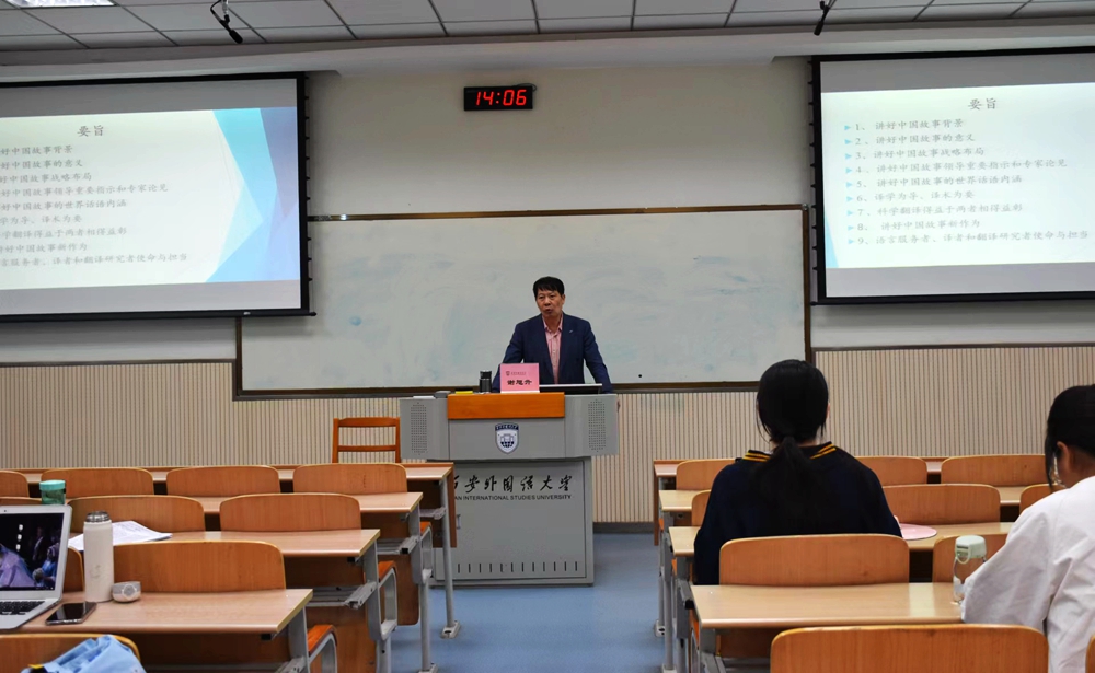 谢旭升教授从讲好中国故事的背景、意义、世界话语内涵等九个方面阐释了其重要性,分析了在翻译中讲好中国故事的新作为。他分享了诸多翻译实例,指出要在翻译实践中要站稳政治立场,充分发挥译者主观能动性,同时要区分“中国英语”和“中式英语”。在问答环节,谢旭升教授结合自身经历分享了提升翻译能力的学习方法。