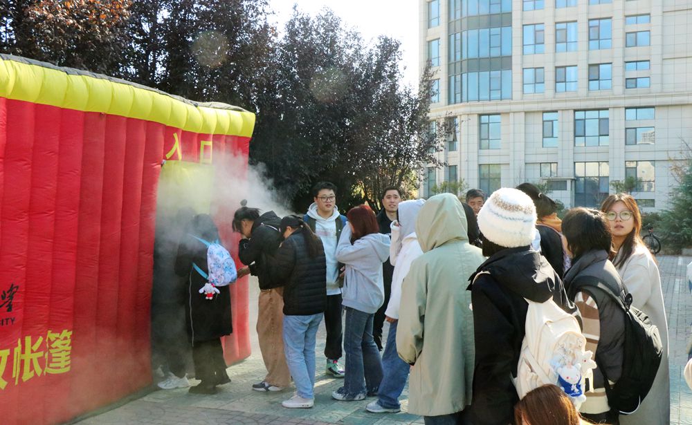 在逃生演练环节,保卫处老师演示了火情中的逃生方法,强调要用左手捂住口鼻、弯腰、右手扶墙,冷静逃离火场。学生分批次进入模拟火场进行演练,运用科学的方法成功逃出火场。