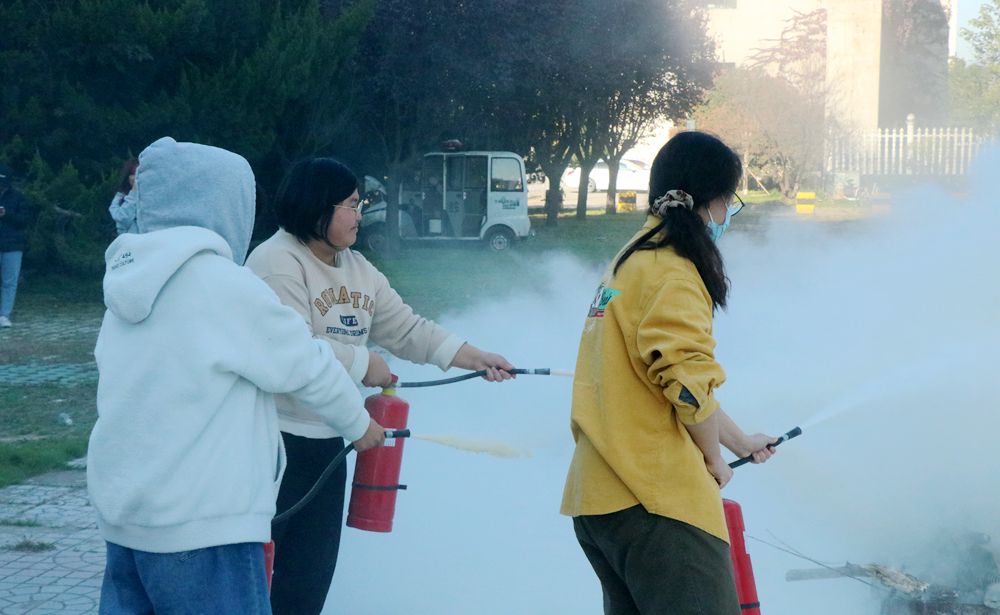 在灭火演练环节,保卫处老师演示了干粉灭火器的使用方法,讲解了“提、拔、拉、压”四步口诀,即提起干粉灭火器;拔出插销及铅封;拉出喷管;将喷管对准火焰根部,距离火源2到3米,右手用力下压喷出干粉灭火。学生分组体验,使用灭火器成功灭除火源。