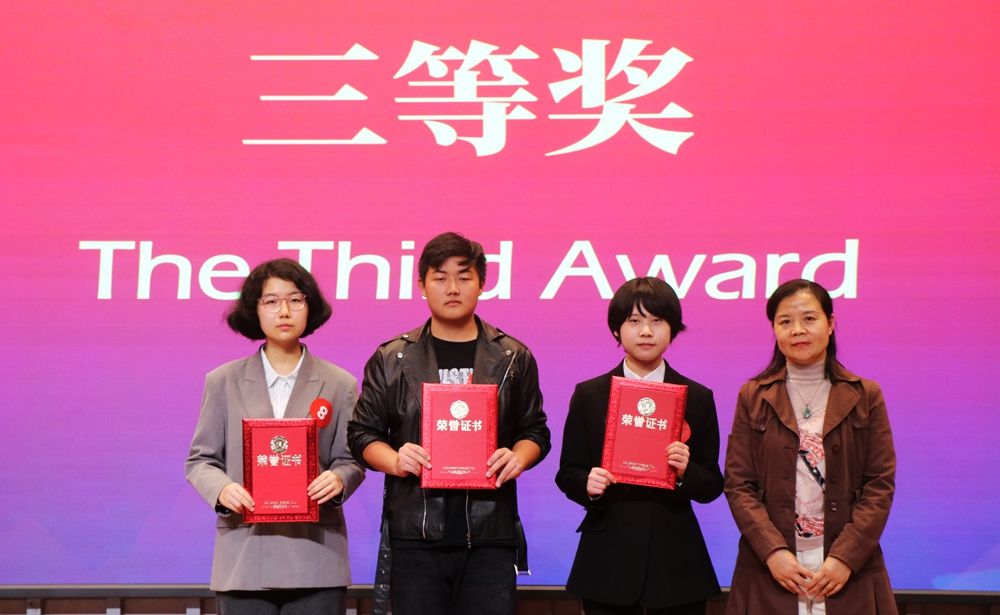赵锐涵、教育学院李娜获二等奖,英文学院胡翔媛、亚非学院孙敖晨朗、英文学院童亚楠获三等奖,英文学院朱鹤寰、李依霓、俄语学院杨佳颖获优秀奖。