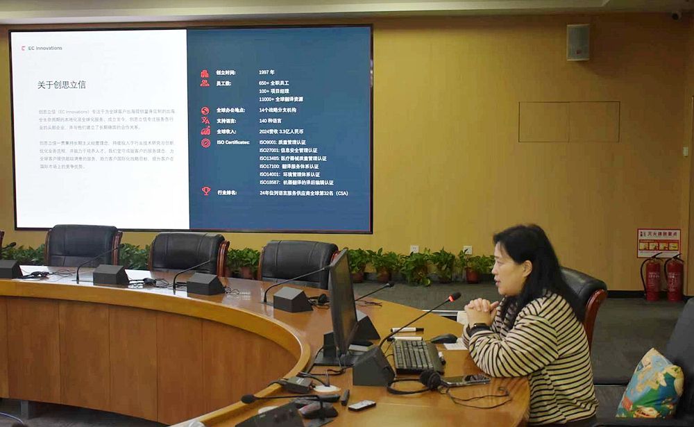 林玲介绍了创思立信的发展现状、业务布局及人才需求,表示随着公司业务拓展至专利服务、游戏开发、生命科学等多个领域,对人才的需求也更加多元化。除传统的翻译岗位外,公司还提供游戏配音、项目管理等多种职位,为语言专业学生提供了更广阔的职业发展空间。她强调,公司青睐具备统筹协调能力、管理潜质以及国际视野的复合型人才,期待与高校合作培养更多具备发展潜力的学生。