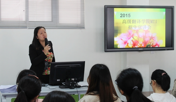 举办2015年翻译硕士专业学位(英语笔译、英语口译)研究生招生校内宣讲会。贺莺副教授、刘育红副教授、曹达钦老师就翻译职业发展、学院研究生课程体系、学习环境、国际交流、校企合作项目、2015年研究生报考有关问题等进行了介绍和讲解。我校各院系本科三、四年级近100名学生参加了宣讲会。