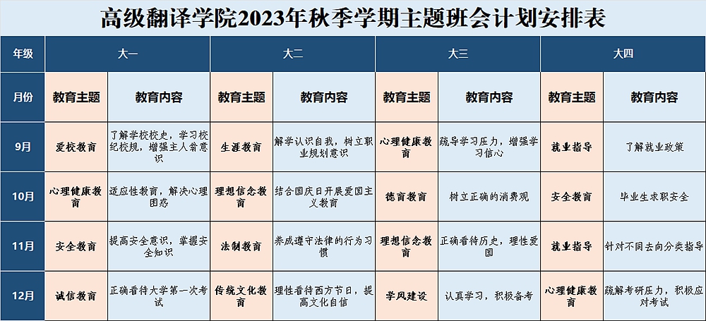 将按照计划要求,结合各年级和不同时间的特点和需要,持续开展好各年级主题班会,教育引导学生适应大学生活、提升综合素质,将思想政治教育、学生日常管理、心理健康教育、职业规划和就业指导等工作做深做实。