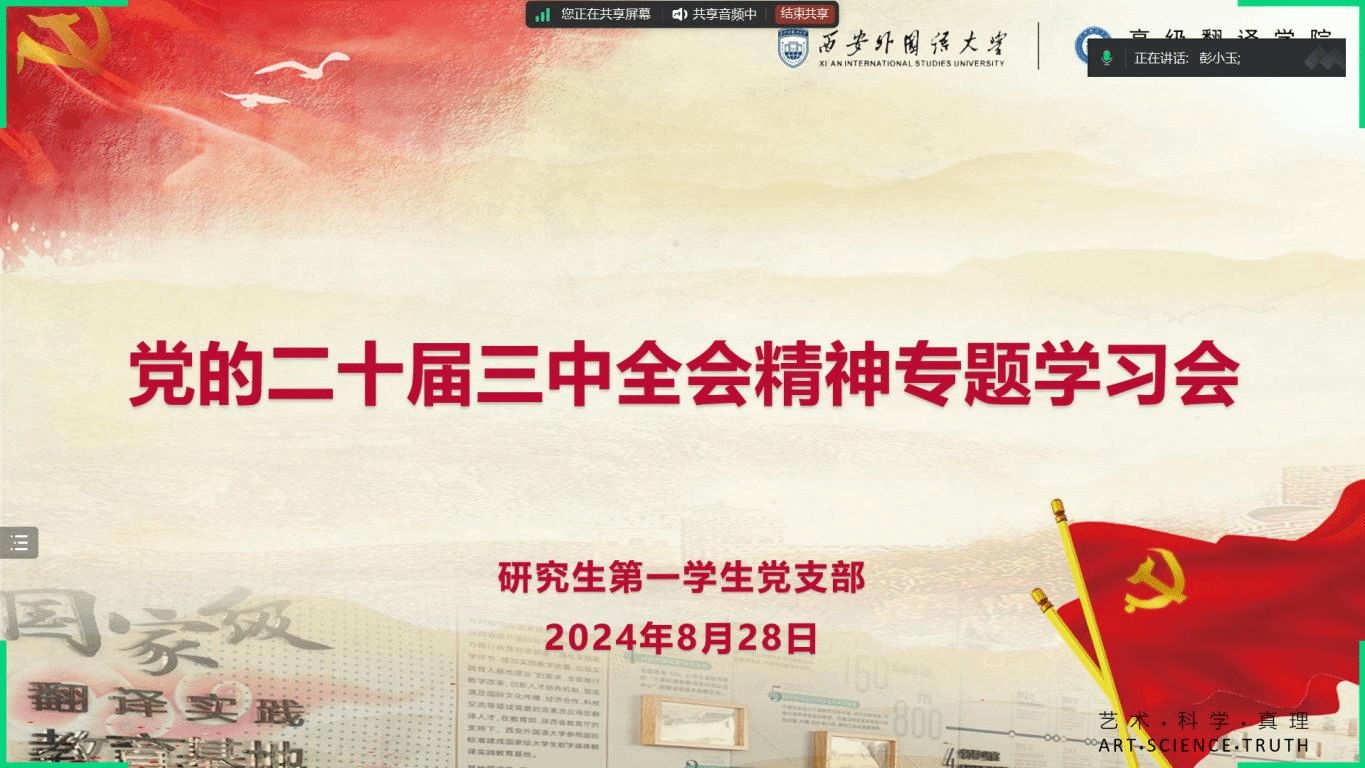 分党委研究生第一学生党支部召开党的二十届三中全会精神专题学习会,支部全体党员、入党积极分子代表参加,支部副书记彭小玉主持会议。
