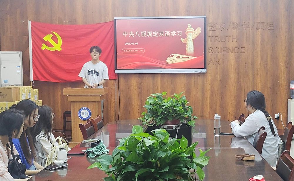 王家续、王琰结合专业特色,开展中央八项规定及《中央八项规定实施细则》等内容的双语学习。他们通过“党的先进性和纯洁性”“党风廉政建设和反腐败斗争”等关键词的双语分享,以小见大地重温了习近平总书记关于作风建设的重要论述,将专业学习融入理论学习,帮助大家深化对“全面从严治党”内涵的理解。