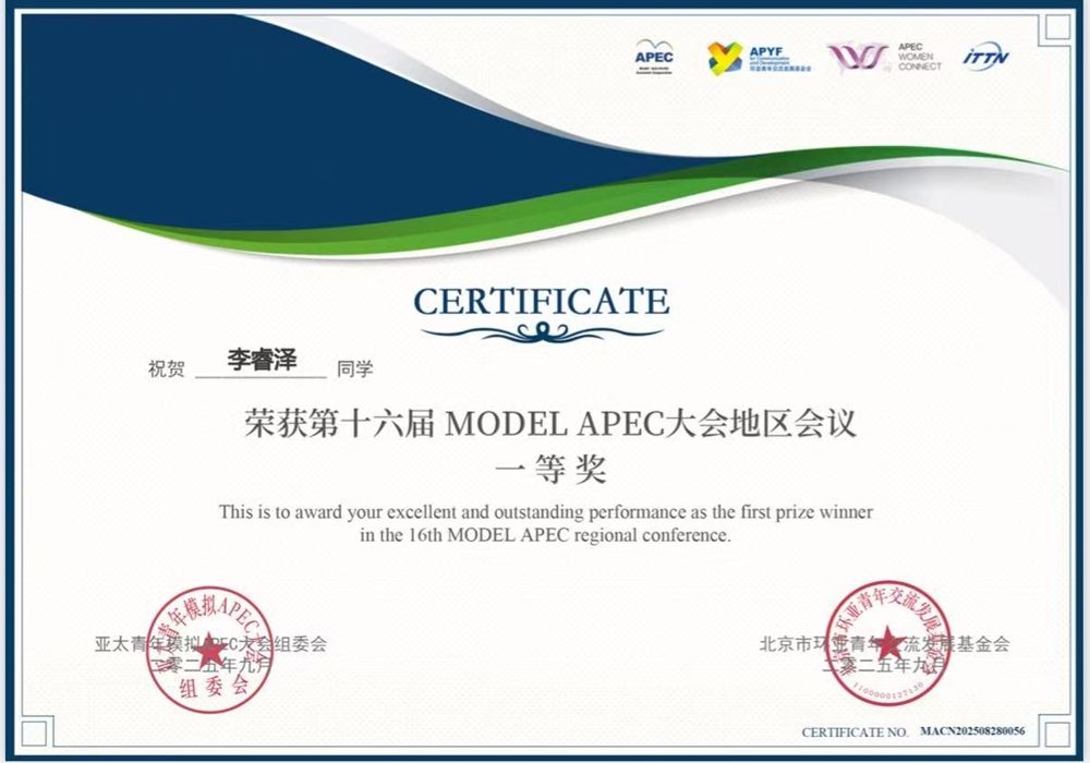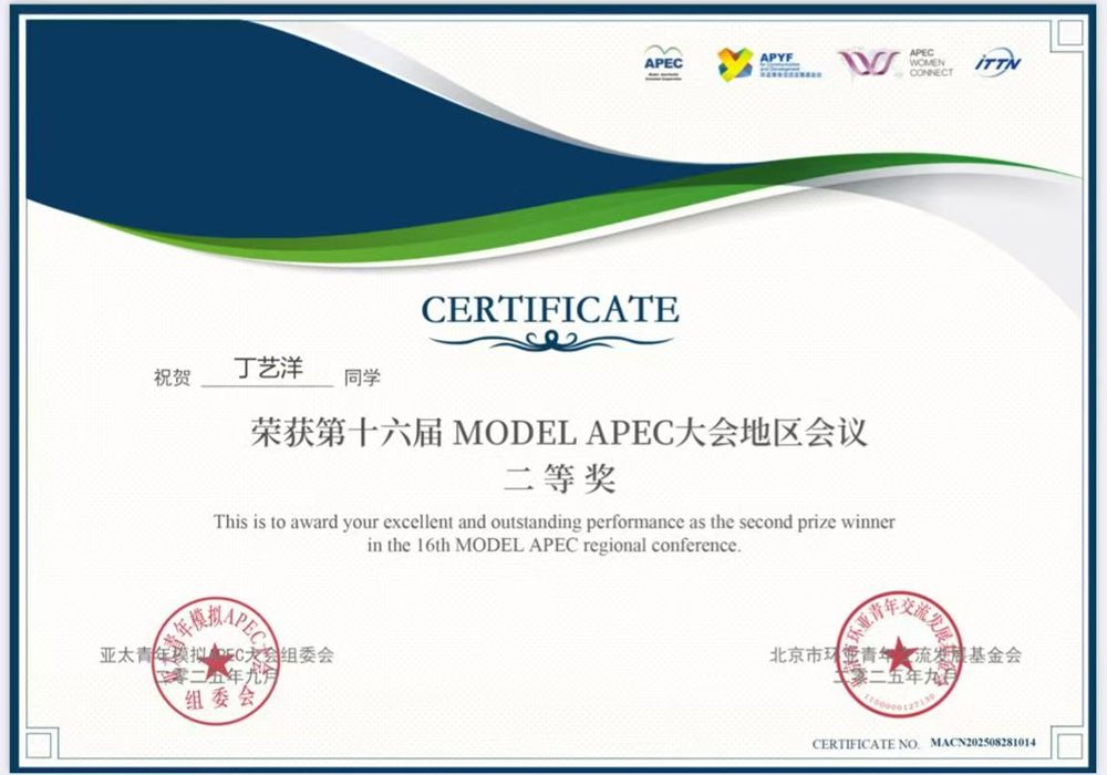 2025年8月23-27日,第十六届MODEL APEC大会地区会议举行,来自数十所高校的136名选手参赛。禁漫 2023级本科生李睿泽、丁艺洋分获一等奖、二等奖。