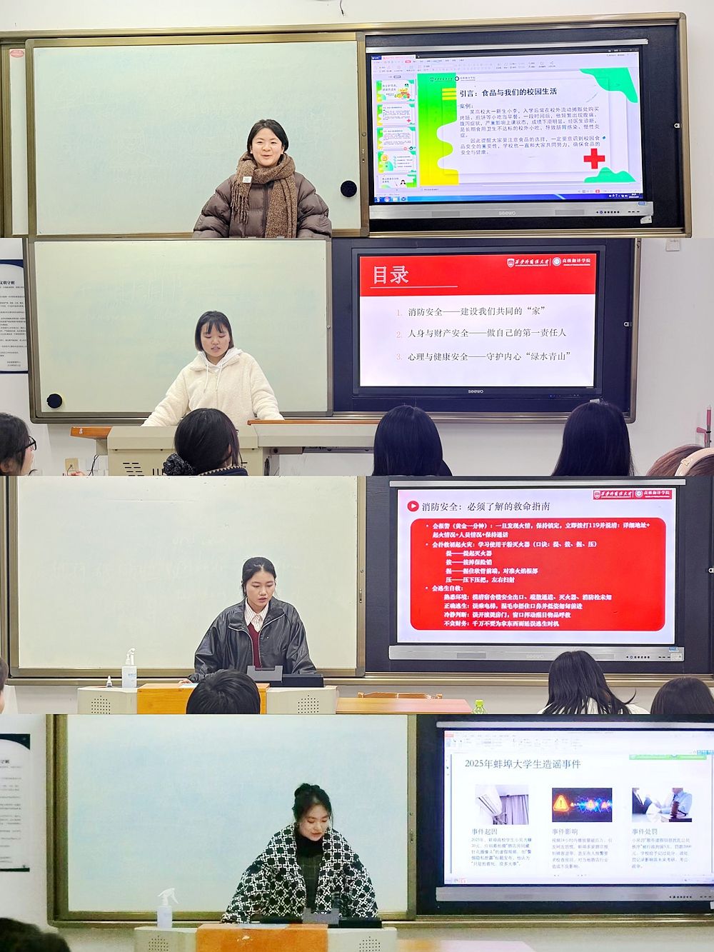 在11月19日的讲座中,杨鑫玉以“食安护青春,健康伴成长”为题,从校园生活实际出发,强调了食品安全的重要性,解读了“四大红线”原则与知行合一理念,明确共建健康校园的具体路径,呼吁新生争做食品安全的践行者、监督者、传播者。张梦琪以“筑牢网络安全防线,践行新时代法治思想”为题,从网络与个人的关联、网络安全战略意义、“四个不能突破” 法治底线、网络安全防护指南等方面,系统介绍了网络安全要点与防诈骗技巧,引导大家提升媒介素养,安全规范上网。