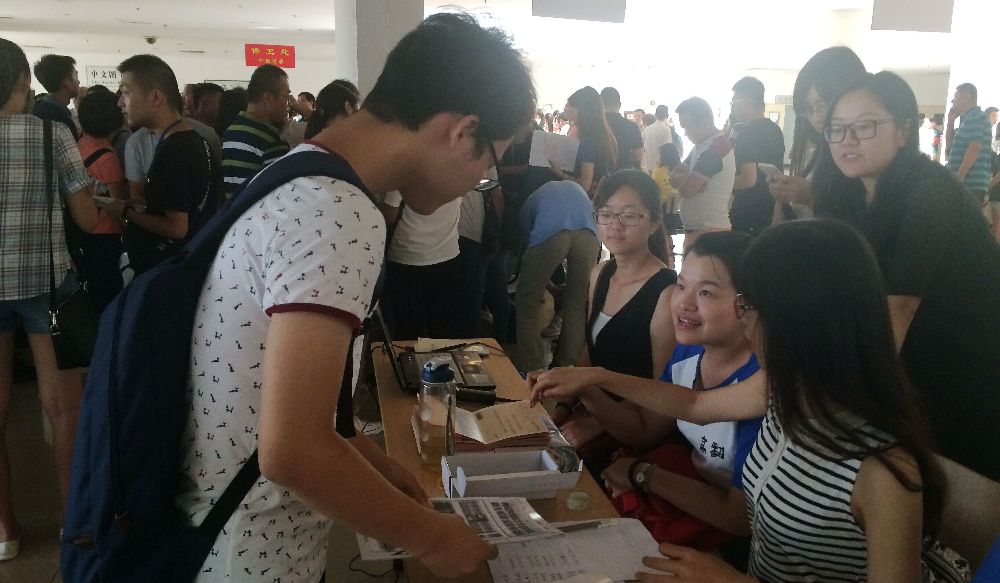 与往年不同,今年新生一进校门首先在接待点领取相关材料,然后在值班学生的指引下到图书馆一楼大厅进行数字化报名。新生大多由父母陪同,半数是第一次离家求学。为培养他们的独立意识,禁漫