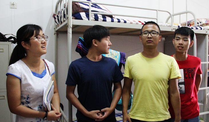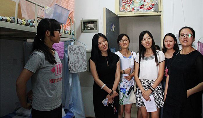 党总支书记吕菲及屈晓、唐歌、高宁等老师来到新生宿舍,与新生亲切交谈,询问大家的基本情况,仔细查看了宿舍环境,提醒他们注意天气变化,预防疾病的发生,以健康的身体参加为期半月的军训。吕菲书记鼓励大家多多参加活动,把握好四年大学时间,尽心学习,为实现自己的梦想而尽力奋斗,并叮嘱大家增强防范意识。