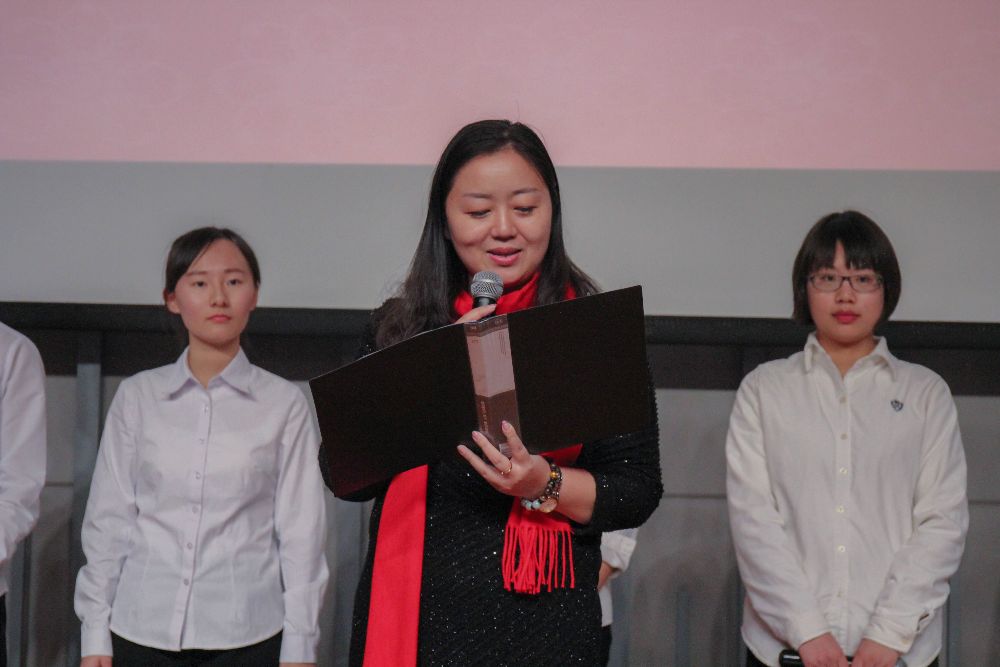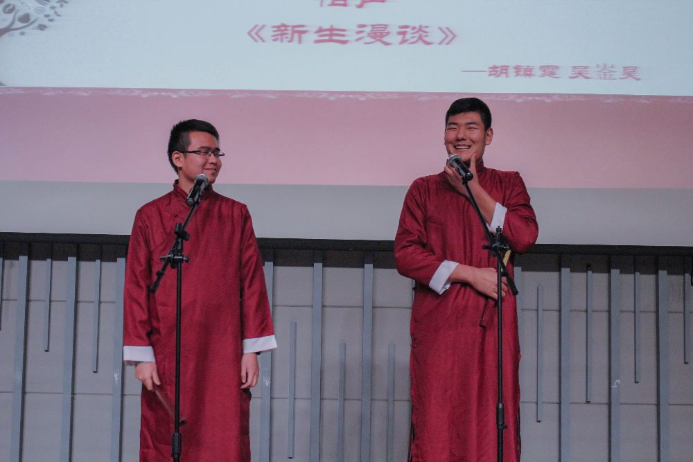今年的迎新晚会形式丰富多样,乐器合奏、舞蹈串烧、小品相声、诗歌朗诵等节目异彩纷呈。同时,老师与同学们同台献艺的精彩画面将现场氛围推向高潮。晚会在啦啦操队员活力四射的舞蹈中拉开序幕。贺莺院长与学习部部员一同带来了唱歌与诗朗诵《没有什么不同》。贺莺院长的深情朗诵和同学的精彩演唱赢得了现场观众的阵阵掌声。之后,刘小勇书记为大家带来了诗歌朗诵《再别康桥》,一首优美的抒情诗宛如一曲优雅动听的轻音乐,伴随着刘小勇书记的朗诵,大家仿佛来到了康桥如梦如幻的诗情画意之中。接着,杜一老师用纯正的英音朗诵了《大卫的诗篇》,带大家一同领略了西方圣经故事的魅力。