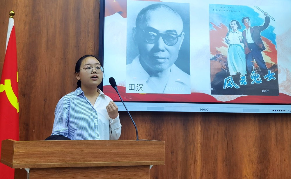 侯琪玥分享了《义勇军进行曲》的创作经过,通过介绍《国家宝藏》中聂耳创作国歌时使用的小提琴,重现了聂耳、田汉等人在创作国歌时付出的汗水与努力。她还带领全体党员观看了电视剧《海棠依旧》中周恩来、邓颖超等人学唱《义勇军进行曲》的片段,回顾了那段慷慨激昂的历史。