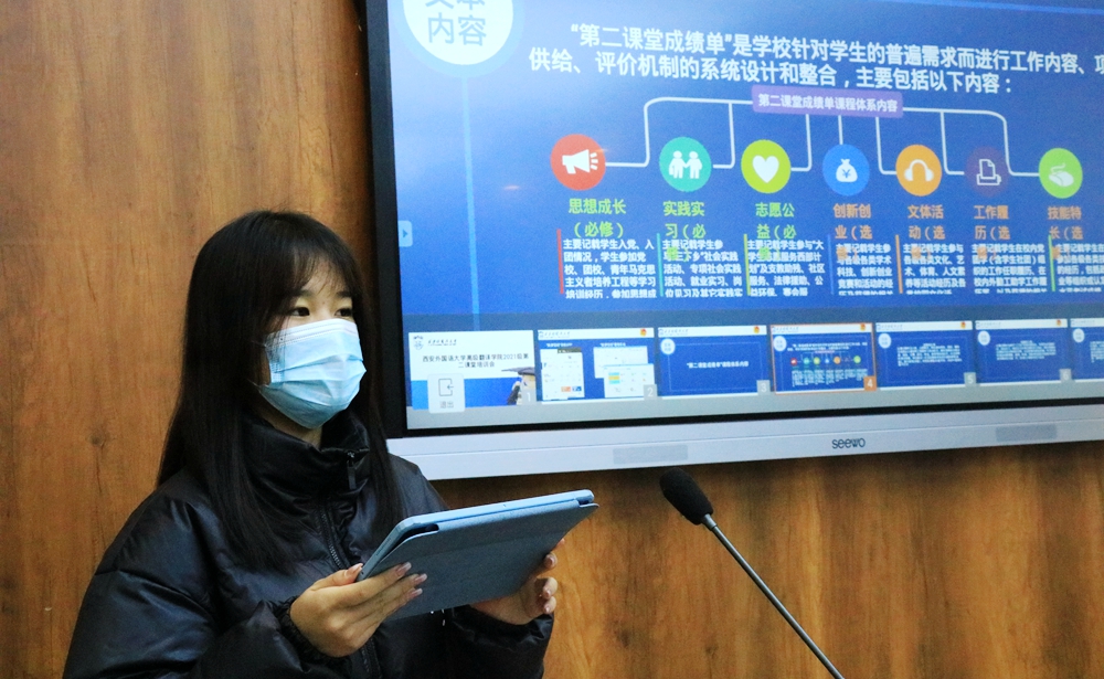 主持人程依琳强调了第二课堂的重要性,讲解了第二课堂成绩单体系的内容,并指导大家在手机端进行操作。她呼吁大家在会后向本班学生传达会议内容,积极参与实践活动。