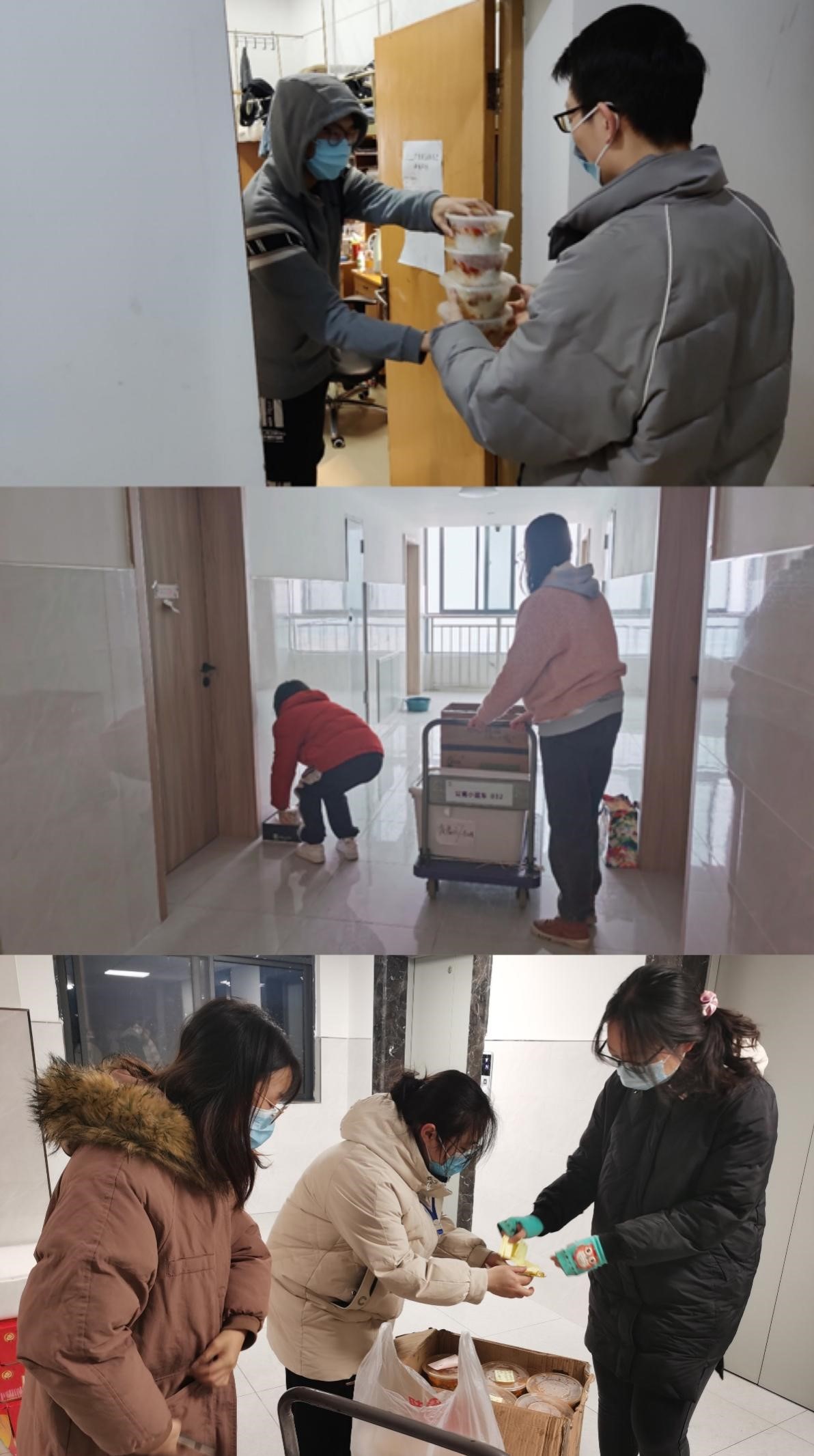 金硕、左桐、李斯然等同志主动请缨,加入党员先锋队,承担起3号、7号公寓楼送餐、生活物资配送等任务。晨午晚一日三餐,他们分楼栋、分楼层、分班级、分宿舍划分好区域。虽然人手有限,但他们相互配合协助、任劳任怨,努力保证每天让同学们吃上热乎的饭菜,满足大家在伙食上的不同需求。