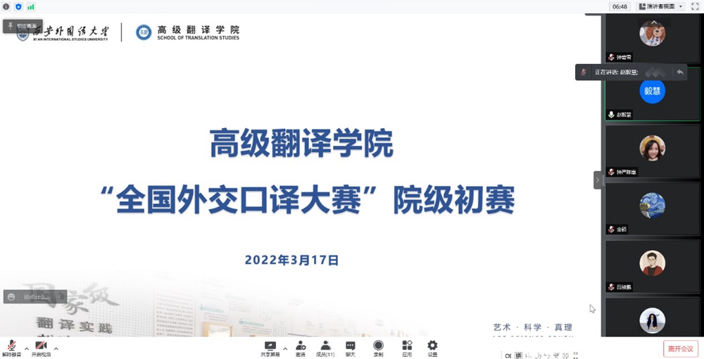 2022年3月17日,禁漫 以线上形式举办第二届全国外交口译大赛院级初赛。禁漫 副院长赵毅慧主持比赛,口译团队教师担任评委。