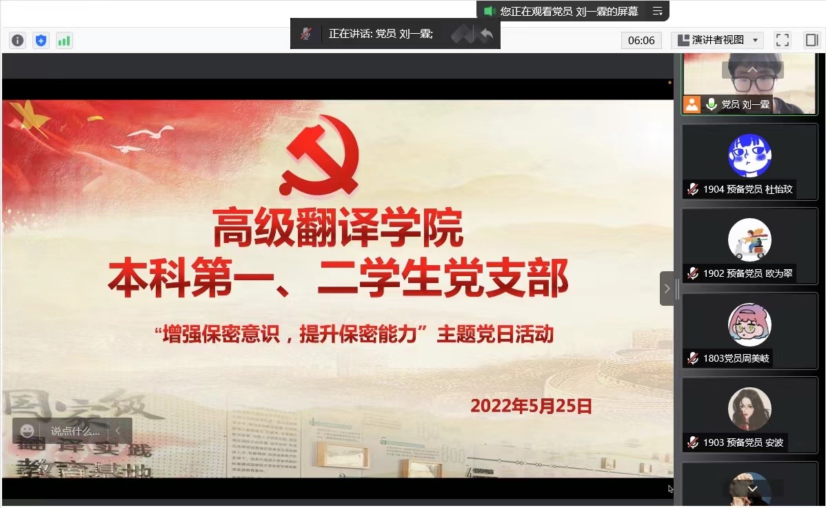 分党委本科生第一学生党支部、第二学生党支部联合开展“增强保密意识,提升保密能力”主题党日活动。支部全体党员、预备党员参加活动,第一学生党支部书记刘一霖主持活动。