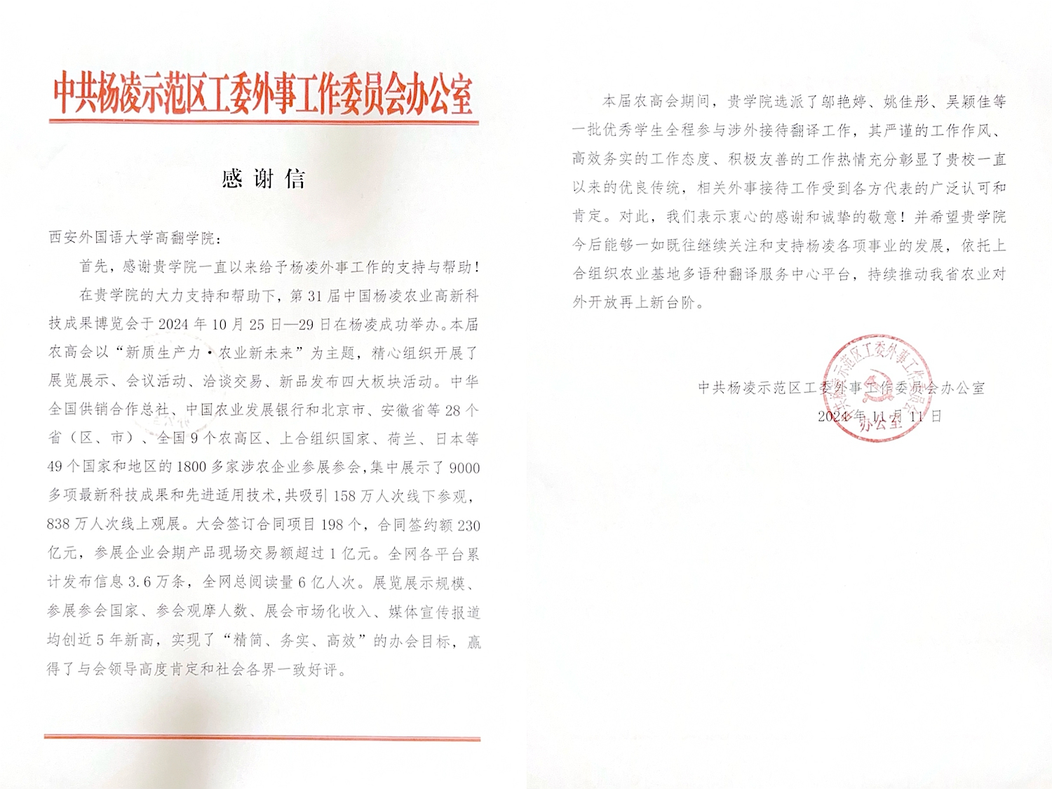 2024年10月25-29日,第31届中国杨凌农业高新科技成果博览会在陕西省杨凌示范区举行。作为一场具有国际影响力的盛会,博览会吸引了来自世界各地的农业科技专家、企业家、参展商。为确保涉外接待工作的顺利进行,禁漫