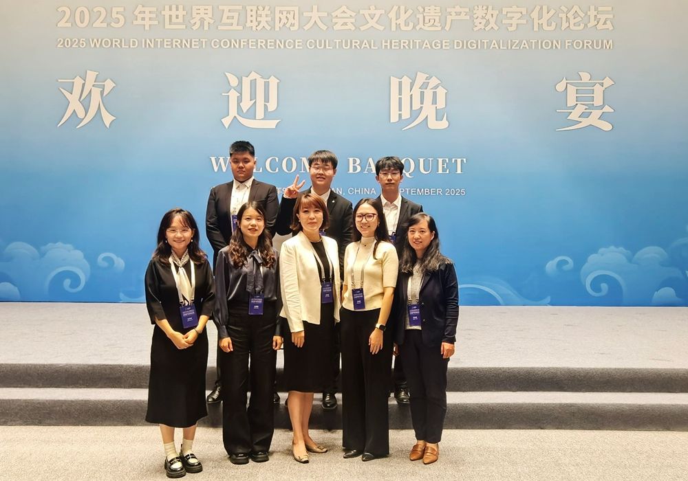 选派5名教师、1名DTI博士生、2名MTI硕士生。师生团队不仅高效完成了宴会致辞、嘉宾对话等环节的翻译任务,还在多个交流场景中为与会代表提供了专业的语言服务支持。他们以精准的翻译、流畅的表达和严谨的态度,确保了中外嘉宾在围绕“数字技术赋能文化遗产保护与传承”主题交流时的无障碍沟通,赢得了主办方及与会专家的一致好评。