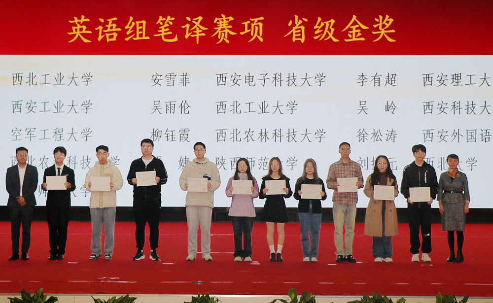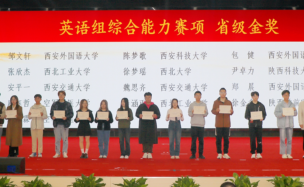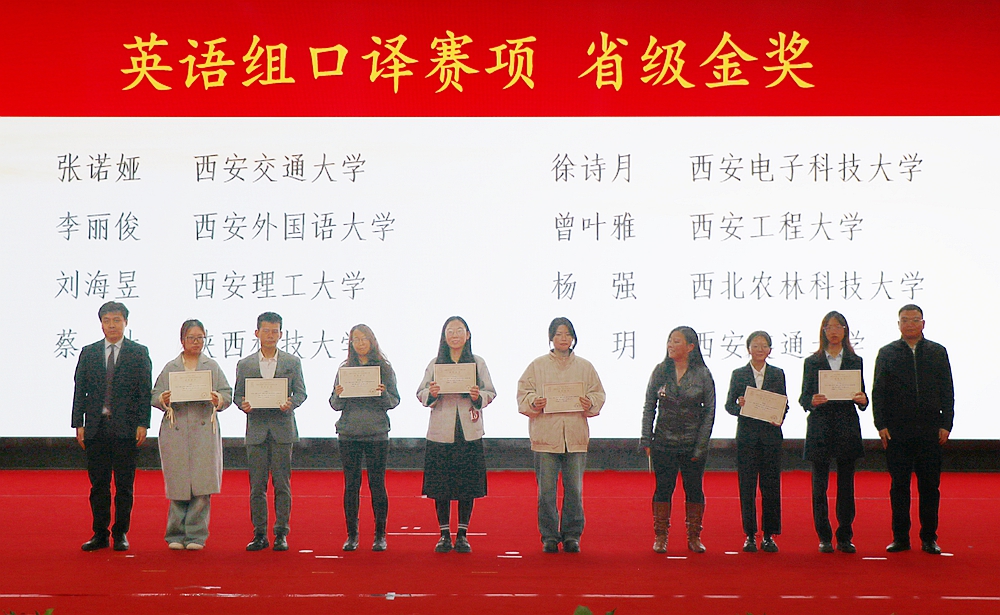 颁奖典礼于3日举行,我校姜亚军教授主持典礼,教育部高等学校外国语言文学类专业教学指导委员会主任委员孙有中教授、我校校长吴耀武教授、陕西省教育厅高等教育处副处长杨才兴、外语教学与研究出版社副总编辑常小玲和大赛评委代表出席并为各赛项获省级金奖的选手颁奖。