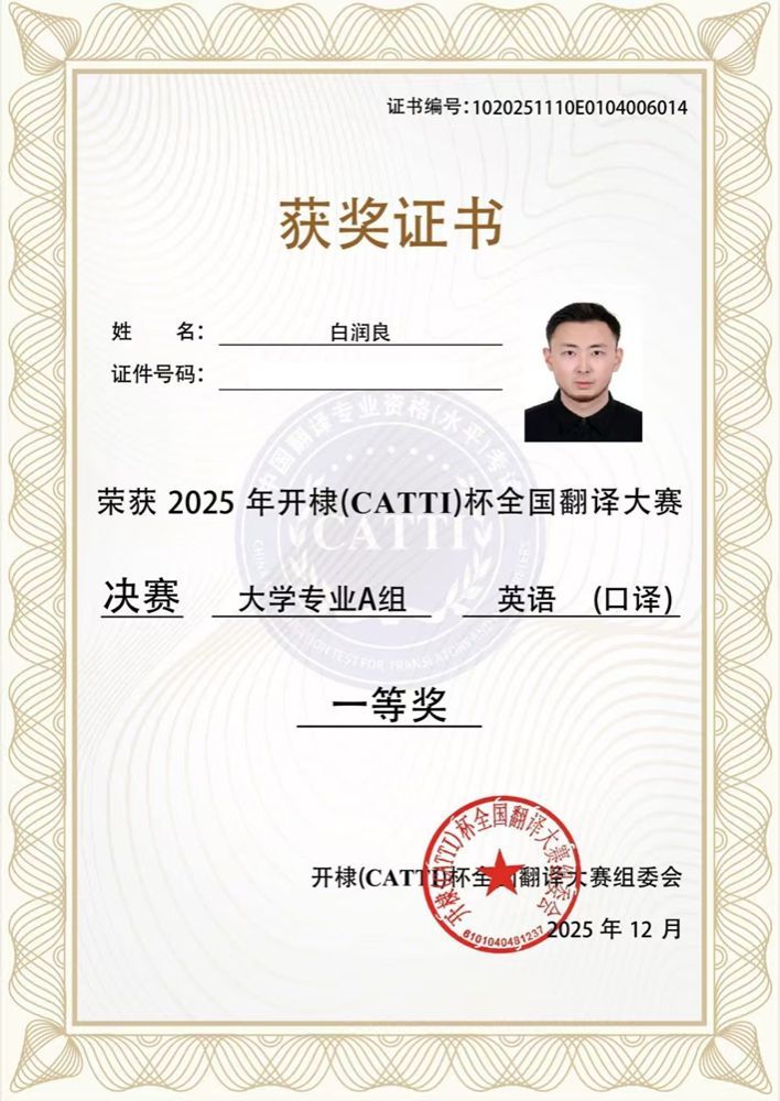 2025级翻译专业博士研究生白润良凭借扎实的专业功底和出色的现场表现,在大学专业A组英语口译赛事中脱颖而出,荣获一等奖。